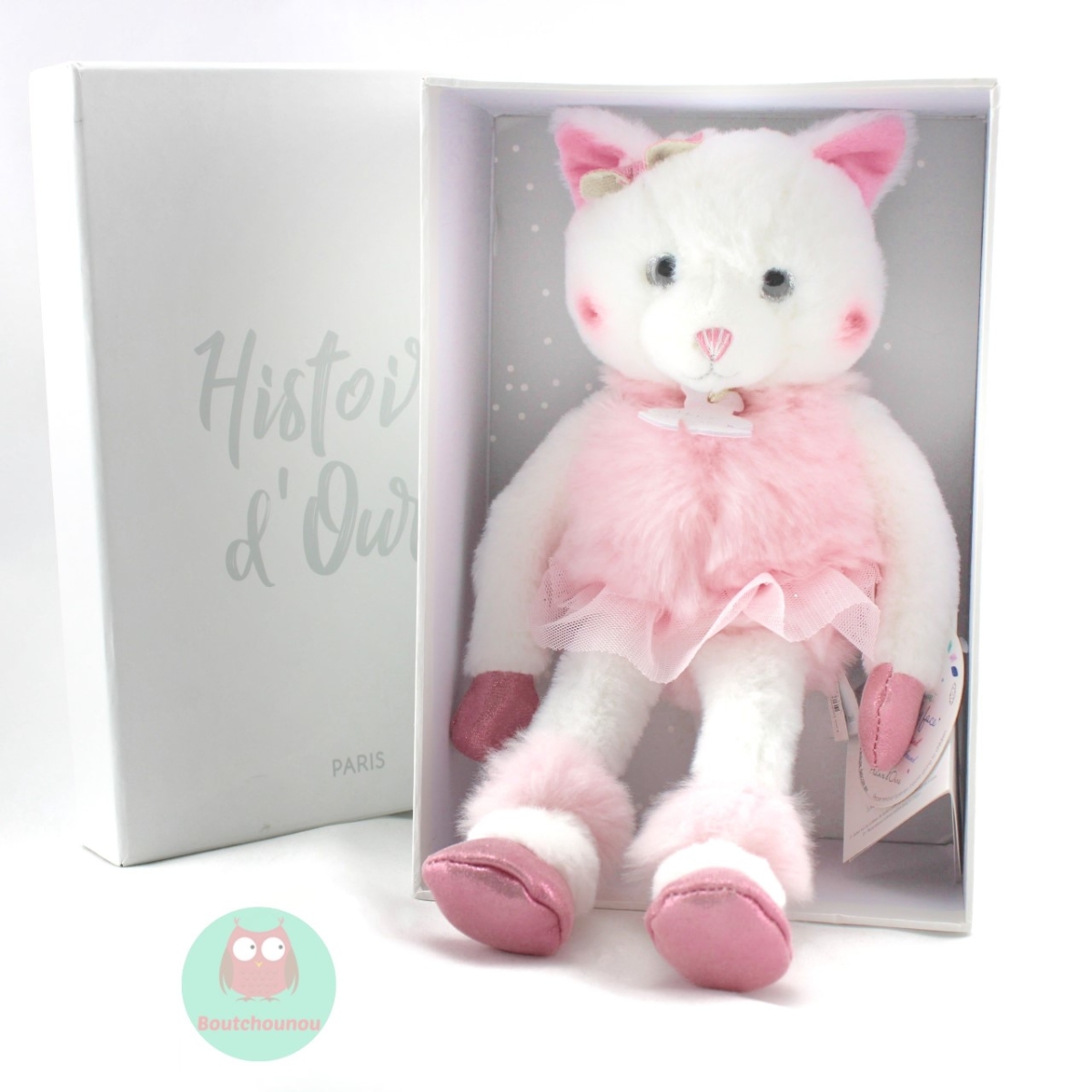 Très beau chat rose et blanc, vêtu d'un tutu rose, +/ 25 cm. Il sera si heureux de suivre bébé partout jusqu'à la sieste.