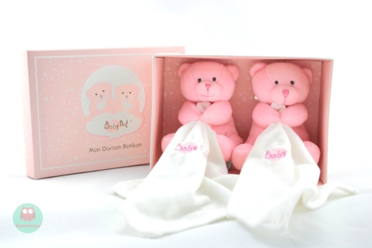 Coffret contenant 2 oursons roses avec mouchoir blanc.