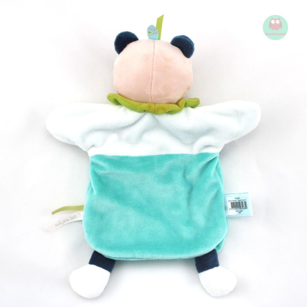Doudou marionnette ours blanc, bleu marine et jaune vert.