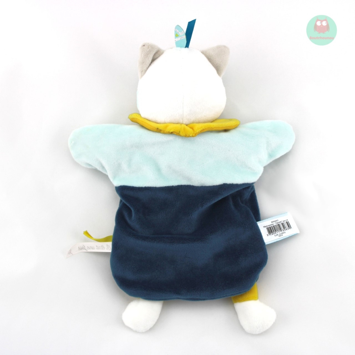 Doudou marionnette râton laveur bleu, blanc, jaune et gris.