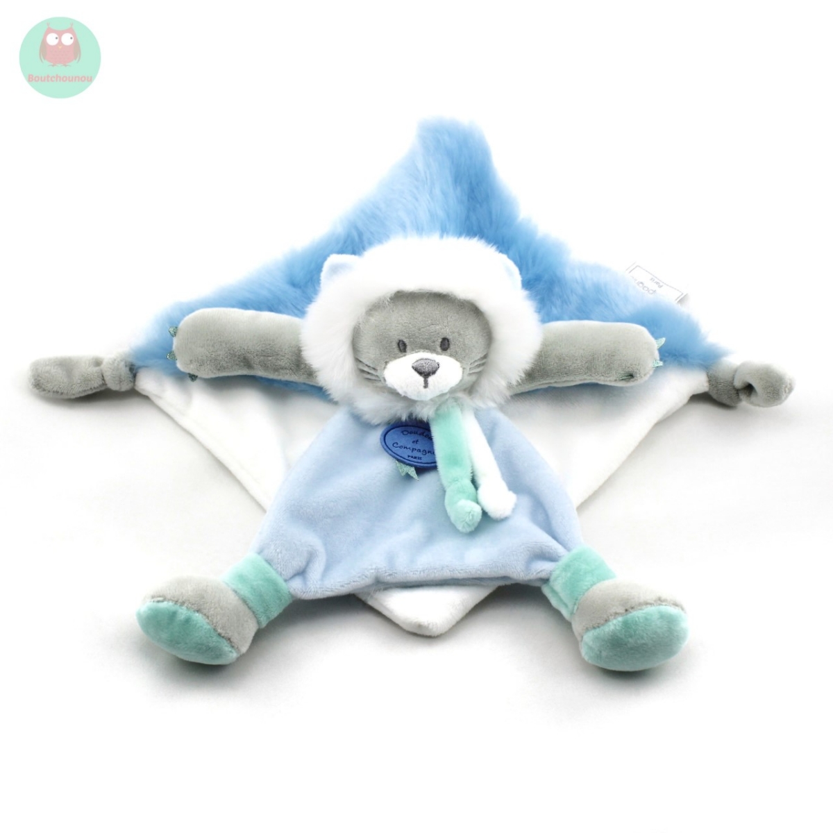 Doudou plat lion bleu, blanc et vert, pratique à tenir par bébé, il sera le compagnon idéal qui l'accompagnera partout.