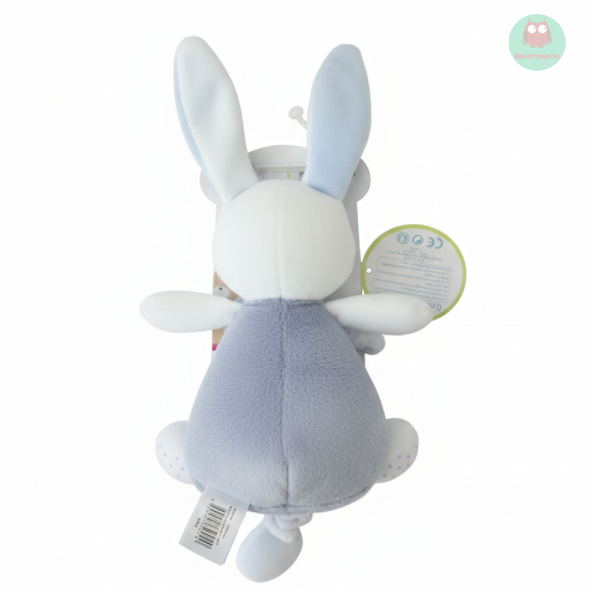 Doudou lapin bleu et blanc, musical, avec petites feuilles.