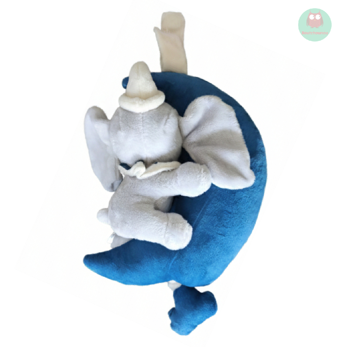 Il se repose sur la lune bleue et peut s'accrocher, par scratch, au barreau du lit ou sur la poussette.